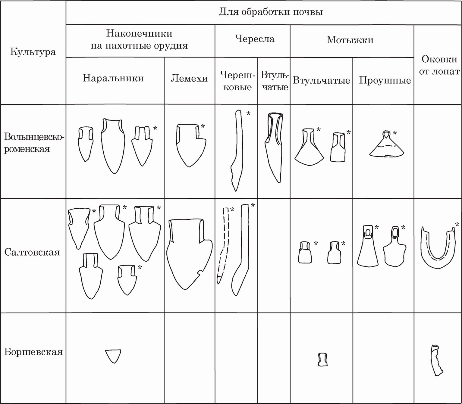 Рис. 74. Территориальная сравнительная таблица орудий земледелия (материалы Донецкого региона; + — есть упоминания в научной литературе. * — материал из Северско-Донецкого региона.